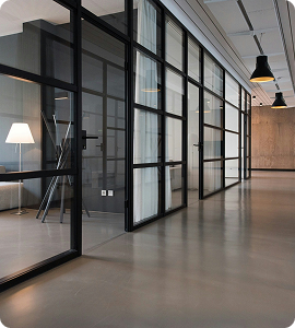 - Двери и перегородки: Используются для зонирования пространства с современным дизайном. Монтаж алюминиевых конструкций выполняется с учетом требований безопасности и эстетики.